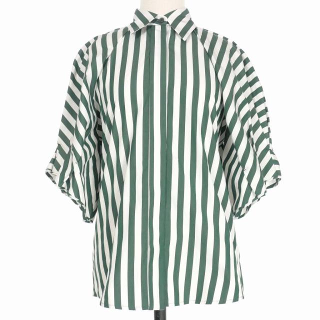 【中古】オデー ODEEH ボリュームスリーブ ストライプシャツ ブラウス 半袖 34 グリーン/ホワイト 1142 23271