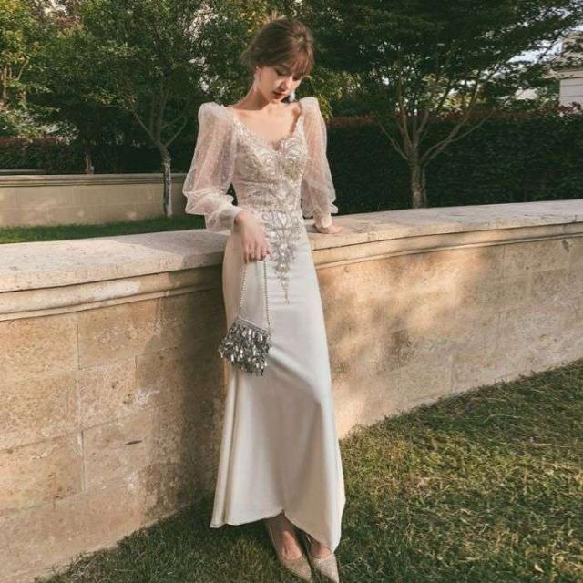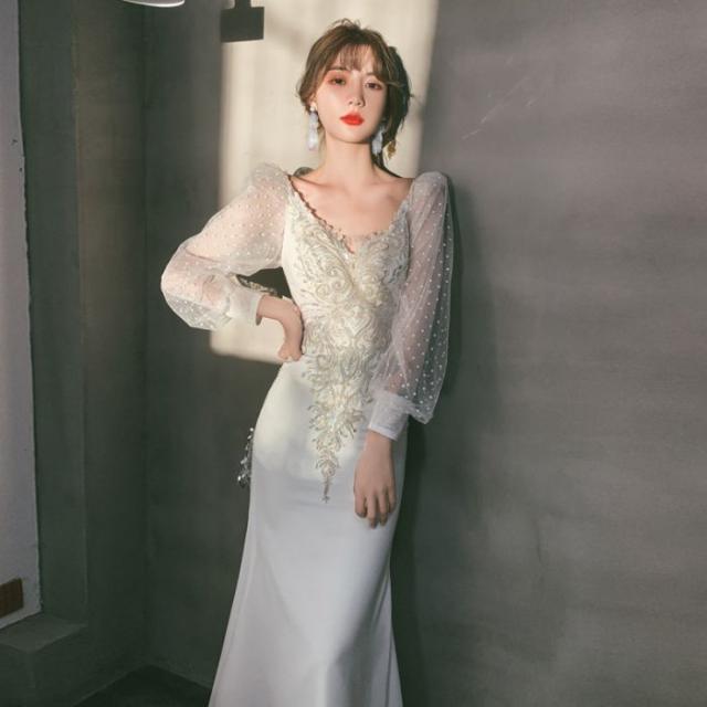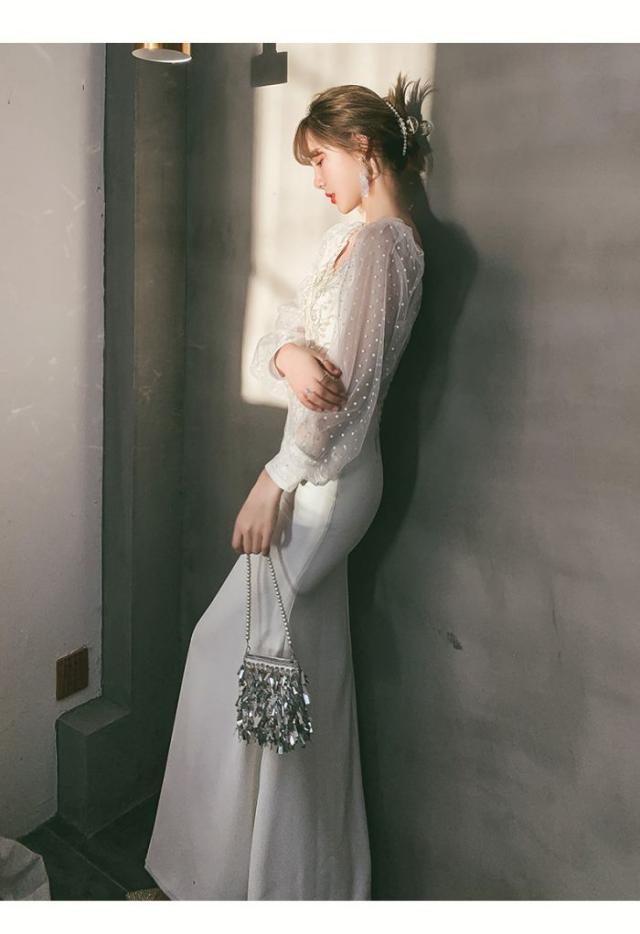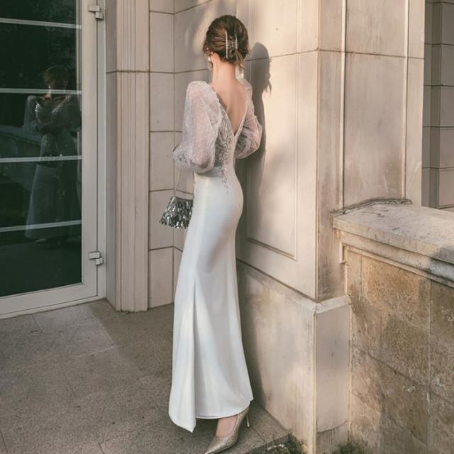 マーメイドラインドレス忘年会イブニングドレスフィッシュテール2024新作パーティードレススカート宴会気質セレブ白ロングワンピース