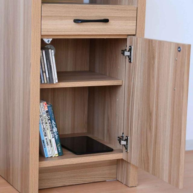 下段は扉収納です。可動式の棚板が1枚ついているので、収納する物に合わせて高さを調節することができます。また、扉収納内にコードを背面に逃がす穴が開いているので、ルーターや充電器などを収納しながら使うことができます。
