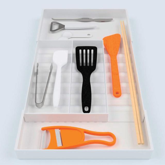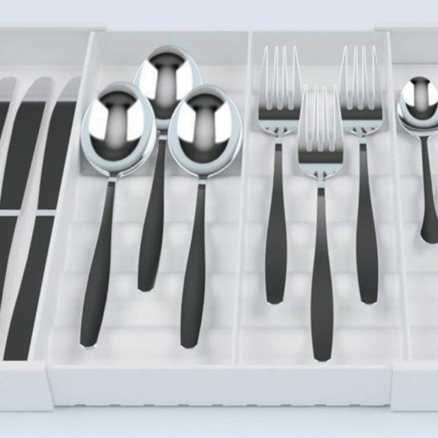 シンプルで機能的な引出し内の整理トレーです。スプーンやはしの収納にオススメです。菜ばしや長いツールもスライドを伸ばして収納できます。入れる物やスペース、用途によって変えられるスライド式トレーは空いたスペースを有効活用もできて、様々なシーンで便利にお使いいただけます。