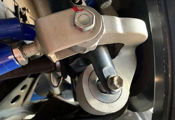 このゴムブッシュをピロにする事で、「ネジレ」・「たわみ」・「つぶれ」が無くなり、常に支点の位置は一定状態になり、アライメント変化もなくなります。
