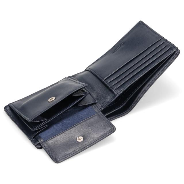 こちらは手触感が良い柔らかな羊革に二重に掛けたミシンステッチでカジュアル感がアップされています。札室2室に加えて、カードが8枚収納可能で、ポケットが3ヶ所あるため、収納力にも優れています。小銭入れにはマチが付いているため、小銭が取り出しやすい設計となっています。