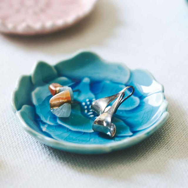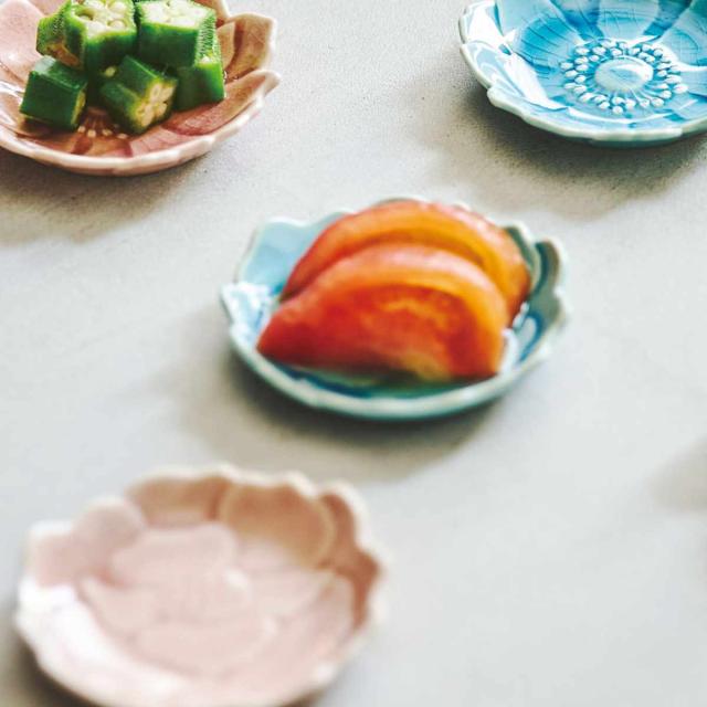 野に咲く美しい花達の姿を形にした「形(かたち)」シリーズです。個性的な形と、陶器製特有の透明感のある釉薬が魅力の豆皿です。ひとつひとつの花びらが立体的で、テーブルに花が咲いたようなシーンを作り出します。