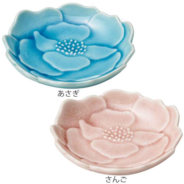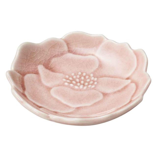 ボタンの花をモチーフにした美しいデザインの豆皿です。直径約7.5cmと小さいサイズで、取り分け用の小皿としても便利にお使いいただけます。食卓を彩るアクセントにおすすめです。