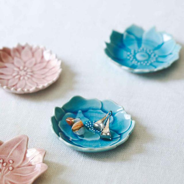 野に咲く美しい花達の姿を形にした「形(かたち)」シリーズです。個性的な形と、陶器製特有の透明感のある釉薬が魅力の豆皿です。ひとつひとつの花びらが立体的で、テーブルに花が咲いたようなシーンを作り出します。
