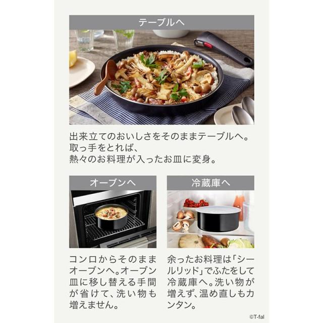 取っ手を外してそのままオーブン調理。出来たてをそのままテーブルヘ。お皿への移し替え不要。お手入れ簡単、お皿感覚で丸洗い。(フライパン・ウォックパン・ソースパン・ガラスぶたは食洗機対応)