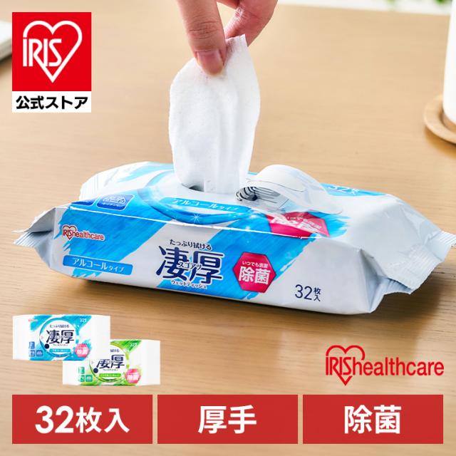 ウェットティッシュ アルコール ノンアルコール 厚め エタノール 除菌シート 厚手 乾きにくい 除菌 持ち運び 凄厚ウェットティッシュ 32枚入り アイリスオーヤマ WTP-32A1P WTP-32N1P