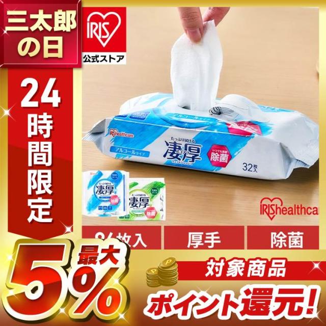 ウェットティッシュ アルコール ノンアルコール 厚め エタノール 除菌シート 厚手 乾きにくい 除菌 持ち運び 凄厚ウェットティッシュ 32枚入り×3パック アイリスオーヤマ WTP-32A3P WTP-32N3P
