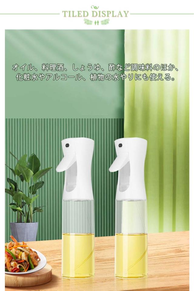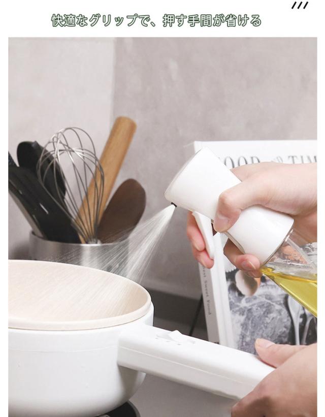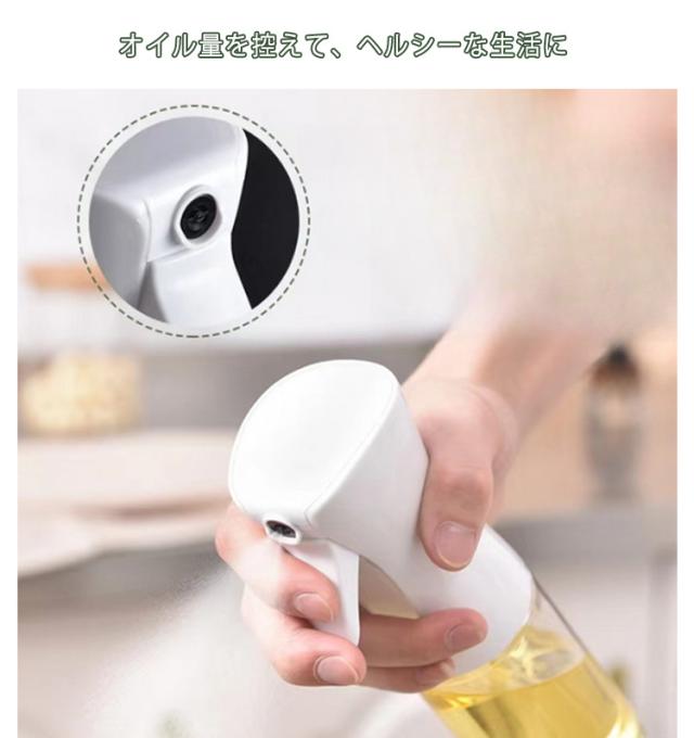 | 加圧式霧吹き、極細ミストを広い範囲にムラなく均一に噴射する。 オイル量を控えて、ヘルシーな生活に。 快適なグリップで、押す手間が省ける。 噴射口のエッジはこぼれ防止設計、ボトルの清潔感を保つ。 オイル、料理酒、しょうゆ、酢など調味料のほか、化粧水やアルコール、植物の水やりにも使える。 | |