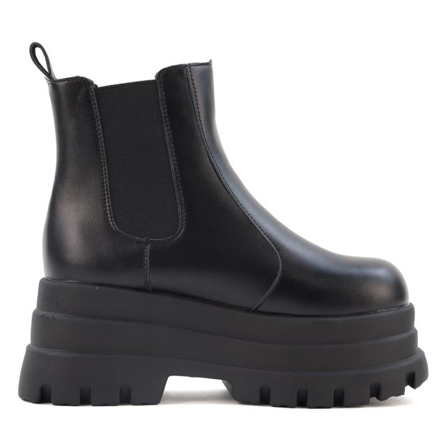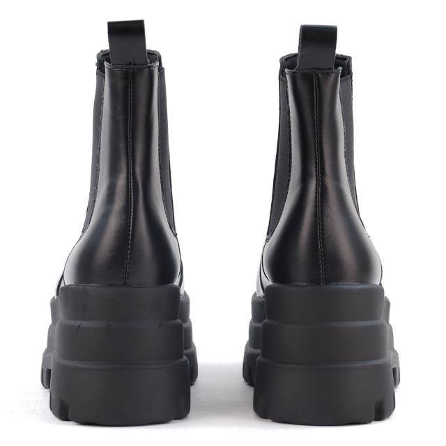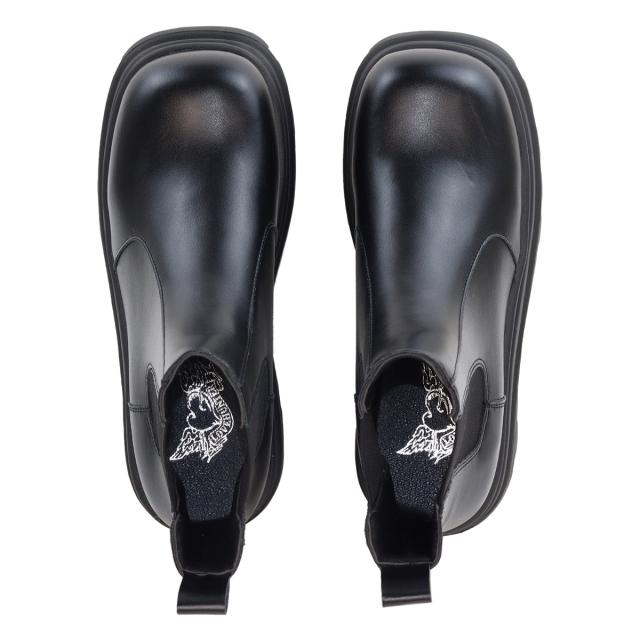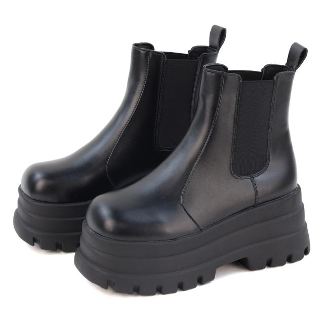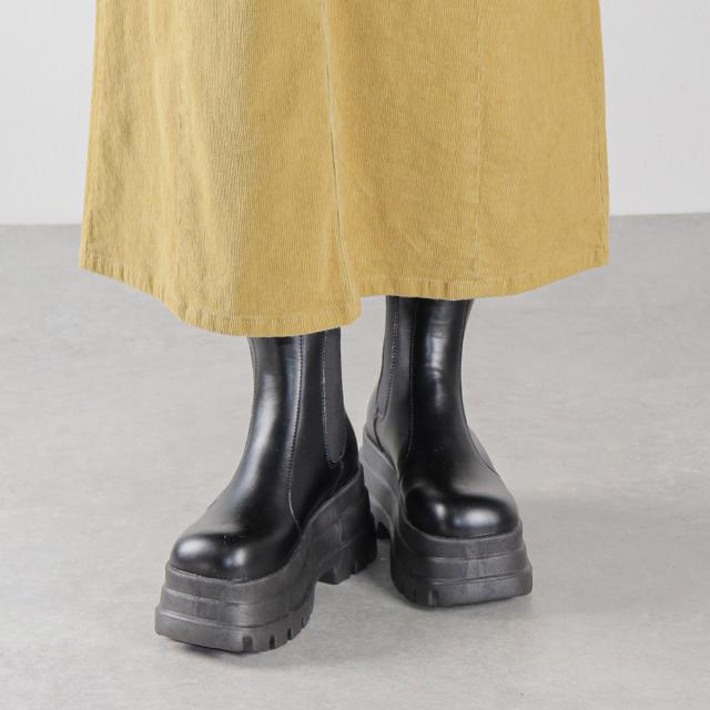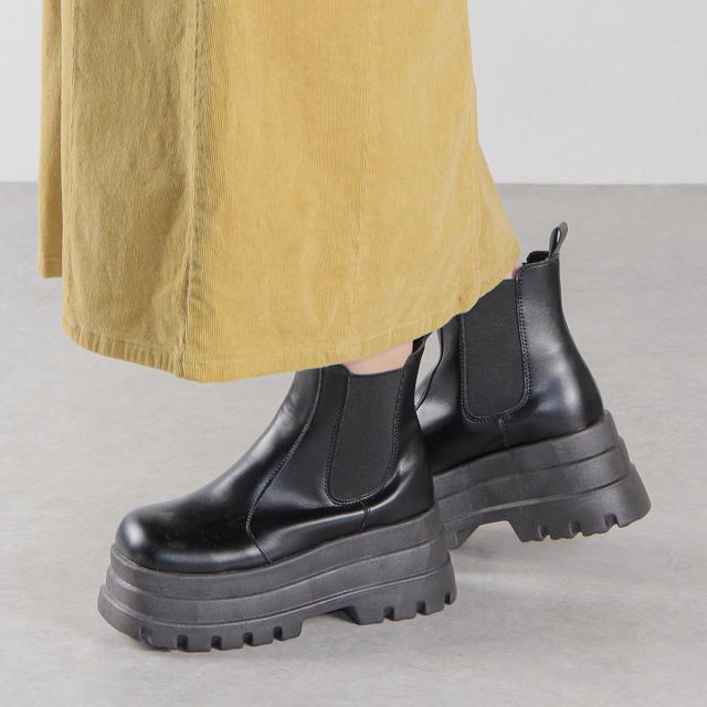 スクエア型のつま先と3段デザインの厚底ソールが特徴的なサイドゴアブーツ。