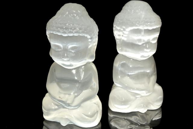 | 特徴・意味 | 浄化力抜群!独特の光沢が美しいセレナイトです。 水に弱い性質を持つので、水場を避けてインテリアとしてお使いいただけます。 仏像の彫刻が繊細に施され、見ているだけで癒やしをもらえそうです。 ジプサム【石膏】は世界中でも最も多く産出される鉱物の一つで、年間1億トンも産出されます。その中でも無色透明なものをセレナイトと呼びます。 メキシコのナイカ山地下において世界最大の結晶の洞窟が発見され、それがジプサムだったのは記憶に新しいところです。加工品として最も一般的に流通しているジプサムはシルキーな光沢の繊維質を持ったホワイトカラーのものが一般的であり、一般的にはそのタイプのものをセレナイトと呼んでいますが、これは正確にはサテンスパーとなります。 その他にもデザートローズ(砂漠の薔薇)などもジプサムの仲間です。 大きく美しい結晶はかつて「聖母マリアのガラス」と呼ばれ、窓ガラスなどに利用されることもありました。 セレナイト(サテンスパーを含む)は非常に柔らかい石で、水や湿気、人の油脂が苦手な為、装飾品には向かない石なのですが、その美しさと清らかなエネルギーから愛好家の多い石でもあります。 |
