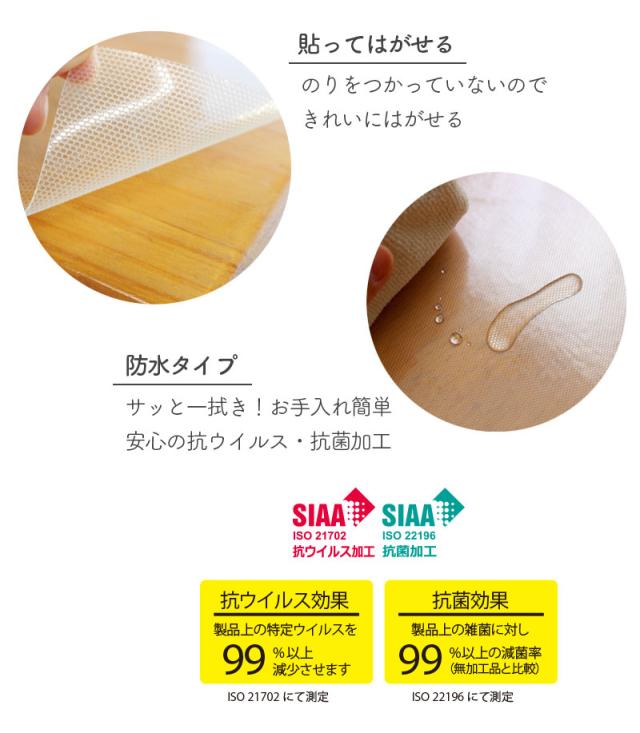 ●本製品は病気の治療や予防を目的とするものではありません。●抗ウイルス・抗菌効果は全てのウイルス・菌に対して発現するものではありません。●抗ウイルス・抗菌効果は、実際の使用状況により異なる場合があります。●製品本来の目的以外の用途でご使用にならないでください。化粧合板、電化製品、システムキッチンや壁などの側面、天井には貼ることができません。●テーブル、机などの表面に凹凸がある場合、粘着力が弱くなる可能性がありますのでご使用はお控えください。●本製品をはがす場合、ゆっくりとはがしてください。●高級家具、塩ビ系塗装、ニス系塗装、ラッカー塗装、海外品や天然塗りものなどにはご使用できません。(表面の状態が変わる恐れがあります)●表面を拭く時に、使用できないものがありますので、下記を必ずご確認ください。(製品の表面状態が変わる恐れがあります)