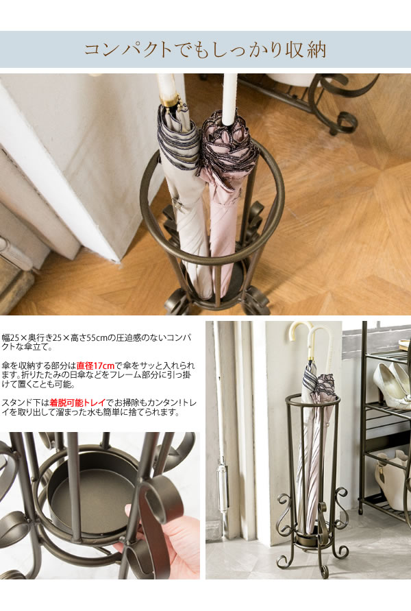 傘立て 完成品 アンティーク調 大人かわいい おしゃれ アンブレラスタンド 傘 収納 かさたて スリム コンパクト 傘入れ 丸型 円形 スチール 受け皿付き 折りたたみ傘 日傘 幅25cm 奥行25cm 高さ55cm 玄関収納 一人暮らし ワンルーム 女子部屋 レトロ 魅せる収納 ゴールド インテリア 収納家具 可愛い 傘 立て カサ立て かさ立て デザイン傘立て 狭い 玄関 インテリア 丸形 円筒 円柱 省スペース ワンルーム クラシック かわいい キュート 姫系 フェミニン キズに強い さびにくい 金色 高級感