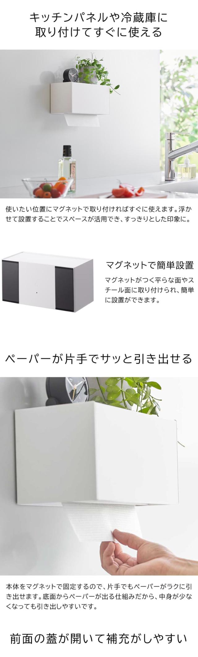 マグネットでキッチンパネルや冷蔵庫に簡単に取り付けられるペーパータオルディスペンサーです。ペーパーは下から引き出す設計で、上部はスマートフォンの一時置きや時計など小物が置けるよう凹みがあるトレーになっています。強力マグネットでしっかり取り付けるので、野菜の水切りや台拭きとして、使いたいときサッと取り出せて便利です。