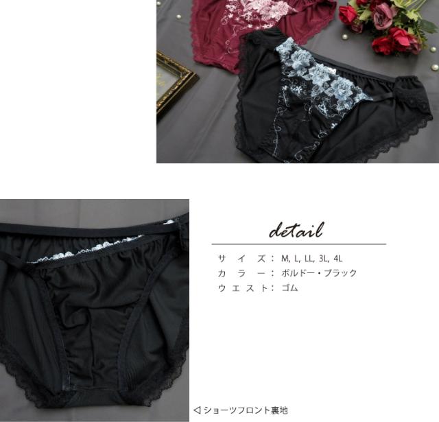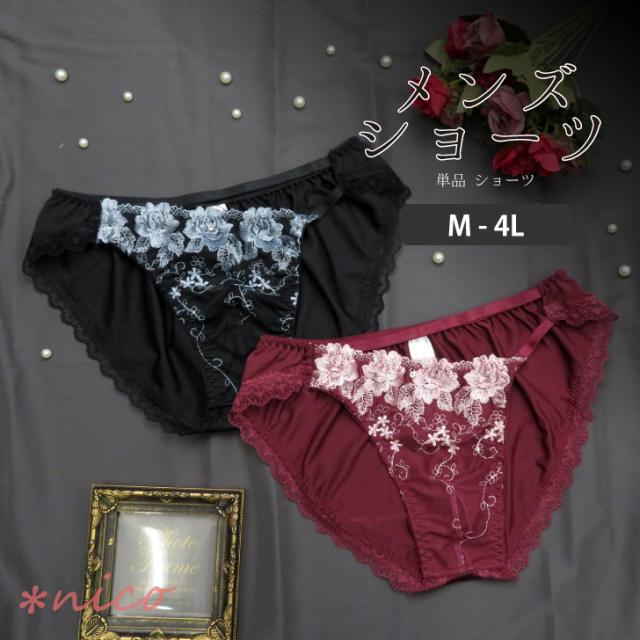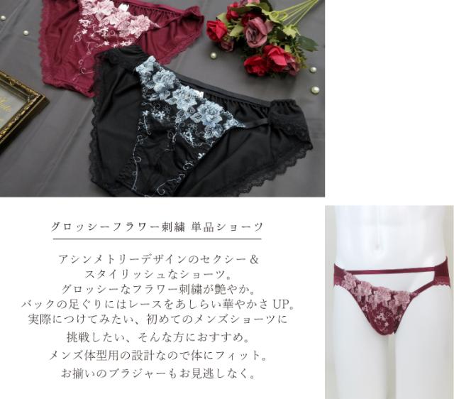アシンメトリーデザインのセクシー&スタイリッシュなショーツ。グロッシーなフラワー刺繍が艶やか。バックの足ぐりにはレースをあしらい華やかさUP。実際につけてみたい、初めてのメンズショーツに挑戦したい、そんな方におすすめ。メンズ体型用の設計なので体にフィット。お揃いのブラジャーもお見逃しなく。
