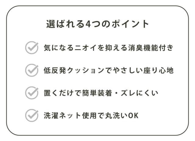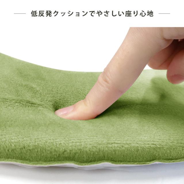 クッション性のあるポリウレタンフォームを使用しているため、座った時にお尻を優しく包み込む低反発仕様です。便座に座った時の耐圧が分散されるので、足やお尻が痛くなりにくいです。
