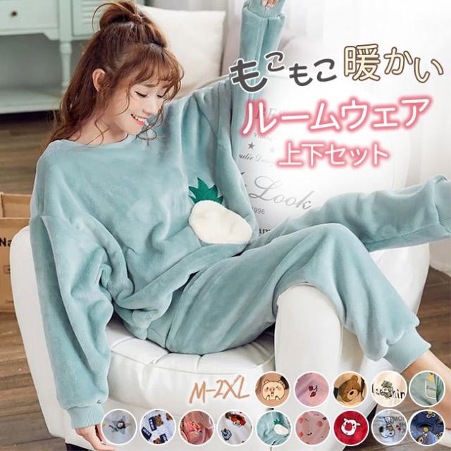 パジャマ モコモコルームウェア レディース ア レディースパジャマ フランネル ルームウェア 大きいサイズ 暖かい上下セット 厚手パジャマ 女性 可愛い部屋着 寝巻き 冬