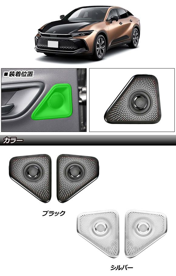 ドアハンドルスピーカーパネル トヨタ クラウンクロスオーバー 35系 2022年09月〜 シルバー ステンレス製 入数:1セット(2個) AP-IT3433-SI ドアハンドルスピーカーカバー スピーカーパネル スピーカーカバー スピーカーガーニッシュ スピーカートリム ツイーターパネル ドアハンドルスピーカー ドアハンドル ドアノブ スピーカー ツイーター オーディオ パネル カバー フレーム ガーニッシュ リム トリム ベゼル プロテクト プロテクター 傷予防 傷付き防止 保護 ガード ステンレス ステン 鋼 SILVER 銀 CHROME クローム 内装 内装パーツ パーツ インテリア ドレスアップ カスタム カスタマイズ 装飾 アクセント アクセサリー アクセサリ AZSH35 TZSH35 クラウン クロスオーバー CROWN CROSSOVER 35 35型 30 30系 30型 RS X G ハイブリッド HYBRID TOYOTA トヨタ自動車 automobile motorcar オートモービル モーターカー カー 車 自動車 車両 506359060