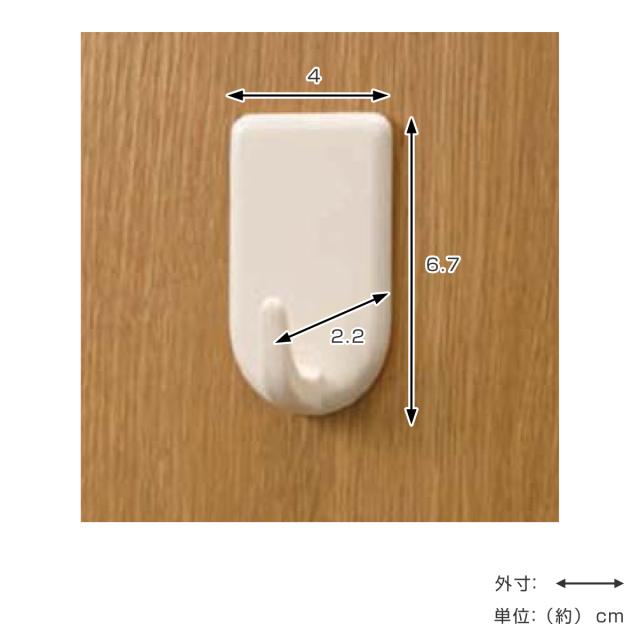 工具や穴を開ける必要がなく、粘着テープで簡単に取り付けできるフックです。キッチンや玄関周りなど、粘着テープが付くところでお使いいただけます。耐荷重は約2.5kgです。