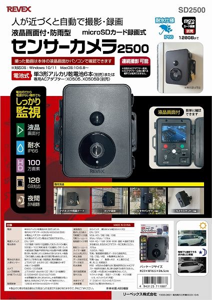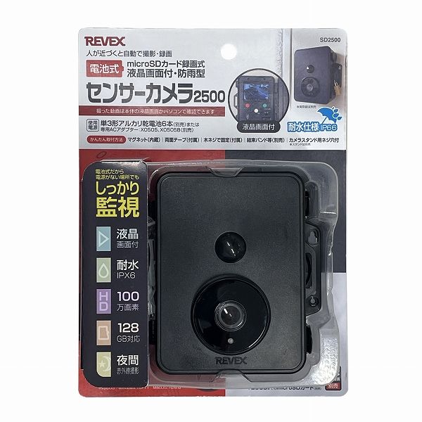 リーベックス/REVEX センサーカメラ2500 microSDカード録画式 液晶画面付・防雨型 SD2500 りーべっくす sensor camera 電池式 録画可能 夜間 赤外線LED 連続撮影 屋外 防犯カメラ 防犯グッズ 安心 安全 セキュリティ対策 セキュリティー対策 不法投棄 侵入者 車上荒らし 農作物荒らし 液晶画面付き 人感センサー 防犯機器 安全機器 ワイヤレス