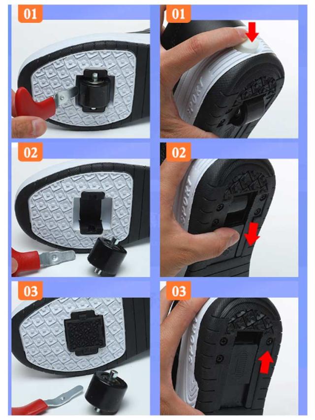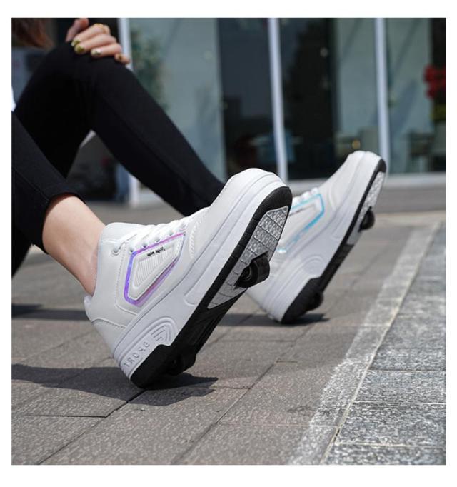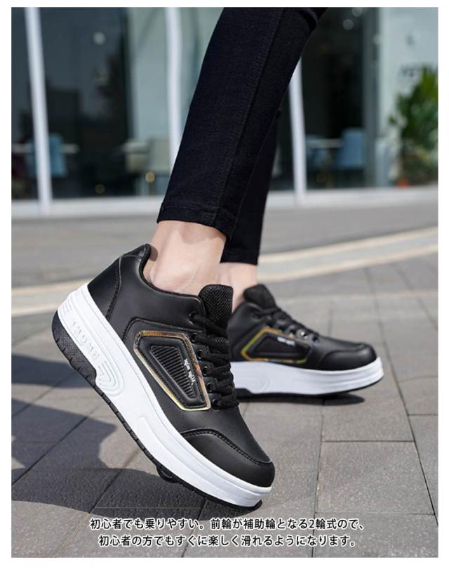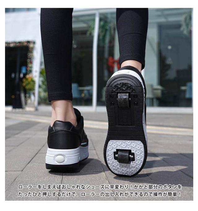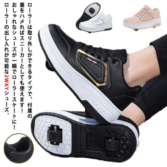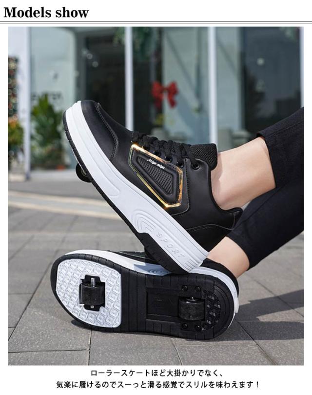 | ローラーは取り外しができるタイプで、付属の蓋をハメればスニーカーとしても使えます!おしゃれなシューズが一瞬でローラースケートに!ローラーの出し入れが可能な2WAYシューズ。 ローラースケートほど大掛かりでなく、気楽に履けるのでスーっと滑る感覚でスリルを味わえます! 初心者でも乗りやすい。前輪が補助輪となる2輪式ので、初心者の方でもすぐに楽しく滑れるようになります。 ローラーをしまえばおしゃれなシューズに早変わり!かかと部分のボタンをたったひと押しするだけで、ローラーの出し入れができるので操作が簡単! 履きやすい設計で、通学はもちろんのこと、おでかけ用としても活躍してくれます。 | |