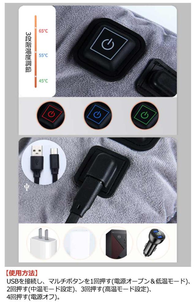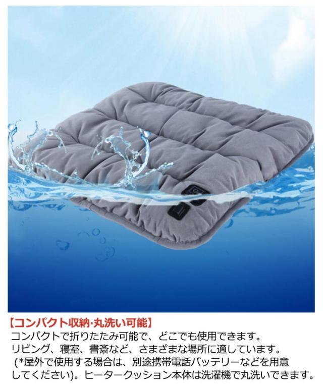 | USB式椅子用ヒータークッション。【3段階温度調節】【丸洗い可能】【使用簡単】 【3段階の迅速な加熱機能とスマートな温度制御】ヒータークッションには3段階の温度制御と迅速な加熱機能が備わっており、5秒で加熱され、中温(55℃)、高温(65℃)、低温(45℃)の中から選んで適切な温度を選ぶことができます。 【ふんわりとした質感】超柔軟なフランネル素材を使用し、他の素材よりも通気性があり保温性が高いです。滑り止めラバー素材の底部は、ヒーターパッドがしっかりと固定され、椅子が傾いても簡単にはずれません。ヒータークッションを椅子やソファに敷くと、クッションとして使用できます。寒い季節に家で仕事をしたり、一日中快適に過ごすために必要なアイテムです。 【高い安全性&過熱防止、過電圧保護】過熱/過電圧保護:当社の電熱パッドには過熱/過電圧保護機能が内蔵されており、電圧が異常な場合、温度制御保護システムが電源を自動的に切断し、安全を確保します。 【コンパクト収納?丸洗い可能】コンパクトで折りたたみ可能で、どこでも使用できます。リビング、寝室、書斎など、さまざまな場所に適しています。 (*屋外で使用する場合は、別途携帯電話バッテリーなどを用意してください)。ヒータークッション本体は洗濯機で丸洗いできます。 【使用方法】USBを接続し、マルチボタンを1回押す(電源オープン&低温モード)、2回押す(中温モード設定)、3回押す(高温モード設定)、4回押す(電源オフ)。 ヒーターパッドは家族、上司、女性の友達などへの素晴らしい贈り物です。 | |
