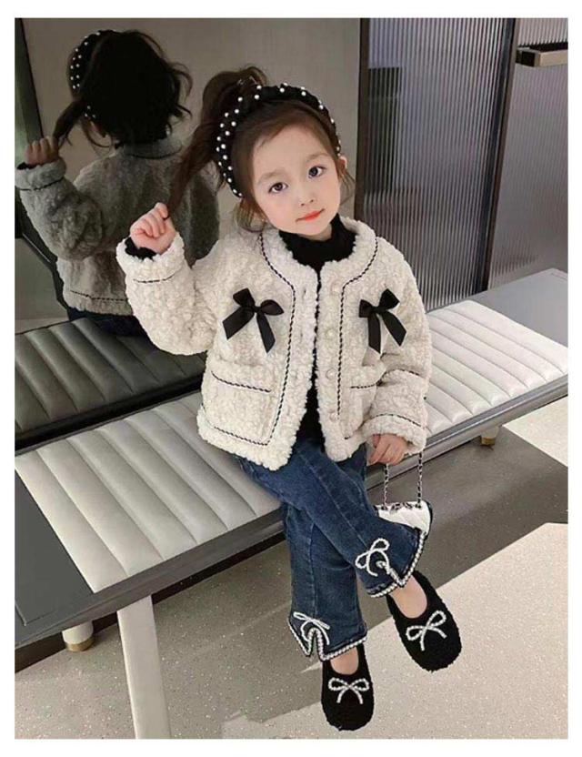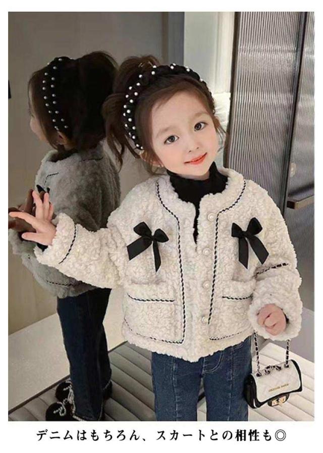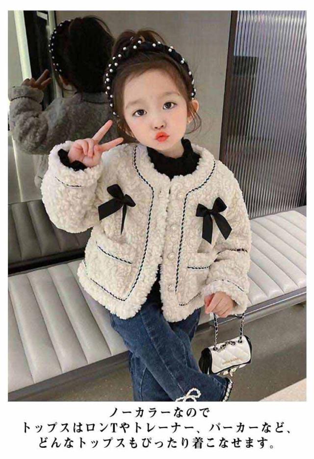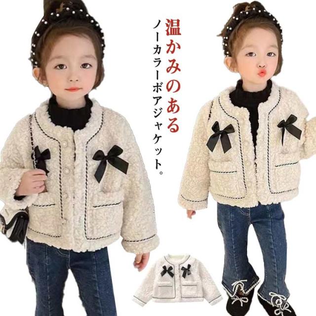 秋冬 ノーカラーコート ボアブルゾン キッズ 子供 ボアコート 90 ショート コート リボン付き ボアブルゾン ノーカラージャケット アウター かわいい 100 ボア 110 120 130