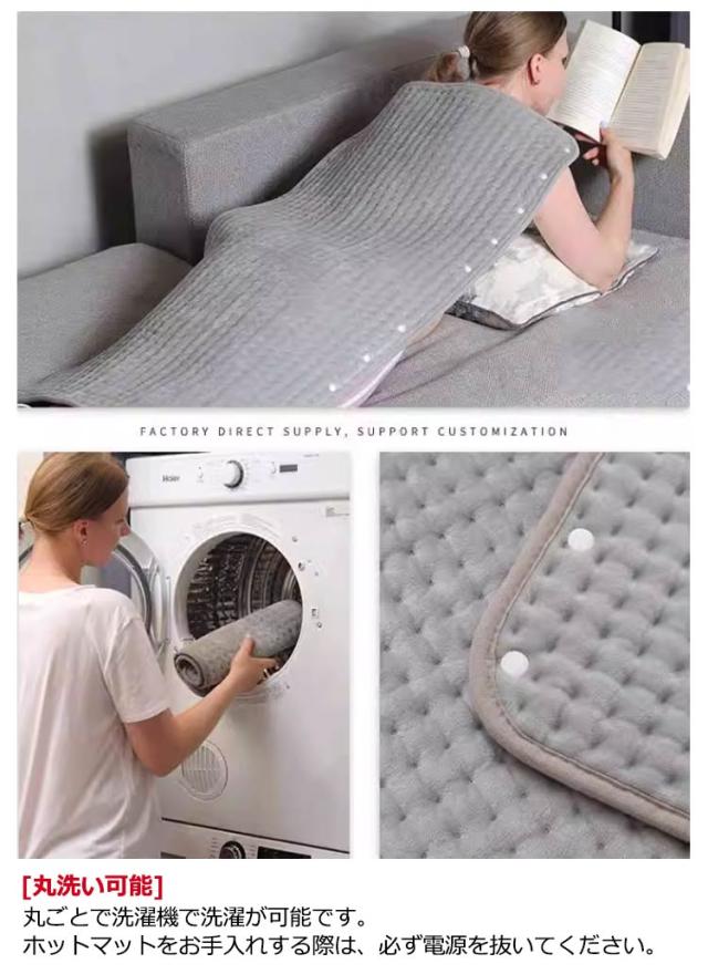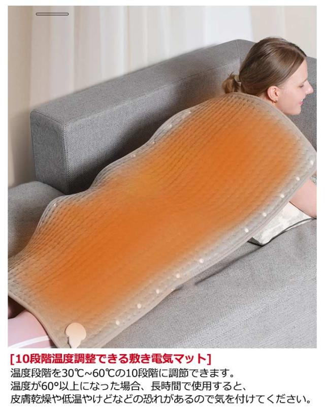 | 10段階温度調整?タイマー機能付?PSE認証済み?日本語説明書付き【多機能ミニホットカーペット?30cm×60cm】 [電気ホットマット] 柔らかい手触りの良いフランネルを使用しており快適な使い心地を体験できるのも魅力です。寒い冬を暖かく乗り越える防寒対策電気ホットマット。家族、友人、師長、リーダーなどへの贈り物もピッタリです。 [10段階温度調整できる敷き電気マット] 温度段階を30℃~60℃の10段階に調節できます。温度が60°以上になった場合、長時間で使用すると、皮膚乾燥や低温やけどなどの恐れがあるので気を付けてください。 [タイマー機能付きの一人用ミニカーペット] 45分、90分、120分のタイマー設定可能。 [すばやくヒートアップ] 電源が入ると、2分が経たないうちにほんのり暖かい。暫くすると、かなり熱くなります。 [丸洗い可能] 丸ごとで洗濯機で洗濯が可能です。ホットマットをお手入れする際は、必ず電源を抜いてください。 | |