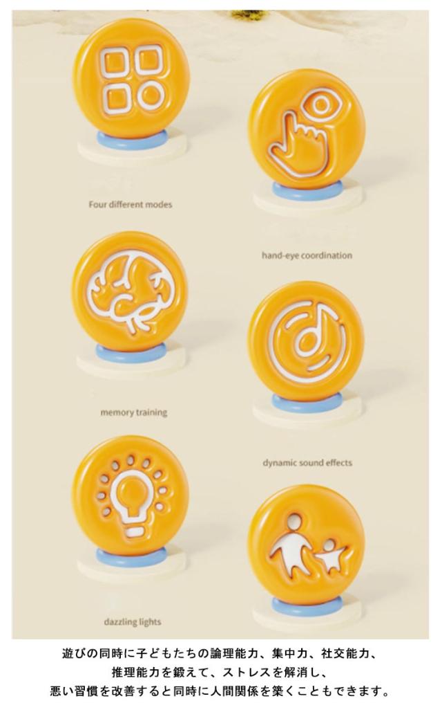 | サイズについての説明 | 13*12.4*5.7cm ※サイズ表の実寸法は商品によって1-3cm程度の誤差がある場合がございます。 【クリアモード】 1.点滅していくボタンを、制限時間以内に素早くプッシュ。 2.2すべてプッシュしたら背面ボタンで次のステージへ。 3.時間オーバーすると、点滅して初期状態に戻ります。 【記憶モード】 1.順番に光るボタンを記憶して、同じ順番でポタンを押そう! 2ボタンを押し終わったら、背面ポタンで次のステーシへ。 【採点モード】 1.光るボタンを押して、ランプを消していこう! 2.すべてランプを消したら、背面ポタンで決定最高100点までポイントが溜まります。 【協力モード】 1.光るポタンを押して、ランプを消していこう! 2.2すべてランプを消したら、背面ボタンで決定! 3.次の人にパトンタッチどんどん制限時間が短くなって難易度UP! |