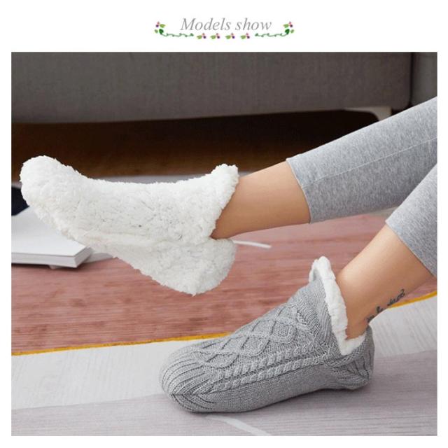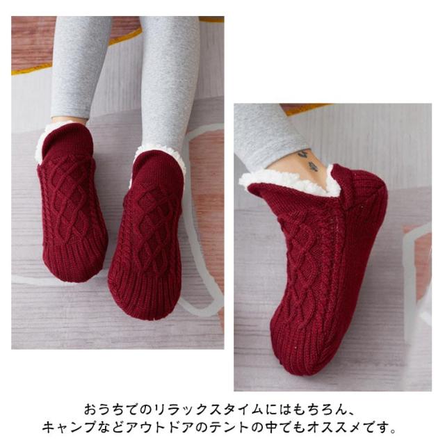 | ふわふわ、もこもこで秋冬にぴったりのシューズタイプのルームソックス。 ケーブル編みのニットと裏ボアの二重構造で保温性も高く、靴下の上に重ねて履いてより暖か。 おうちでのリラックスタイムにはもちろん、キャンプなどアウトドアのテントの中でもオススメです。 足底滑り止め付きでルームシューズ代わりにしたり、贈り物にもピッタリです。 | |