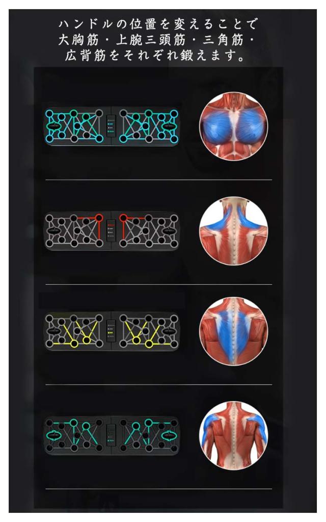 | 上半身の4部位の筋肉を効率よく鍛えられるプッシュアップバー。 ハンドルの位置を変えることで大胸筋・上腕三頭筋・三角筋・広背筋をそれぞれ鍛えます。 ハンドル部がシリコン生地で滑りにくく、手に馴染みやすい。集中してトレーニングを行うことが可能です。 本体裏側にすべり止めゴムが装着可能でトレーニング中も滑らず安心です。 使用後はコンパクトに収納できる設計なので省スペースに保管でき、家庭での筋トレにもおすすめです。 | |