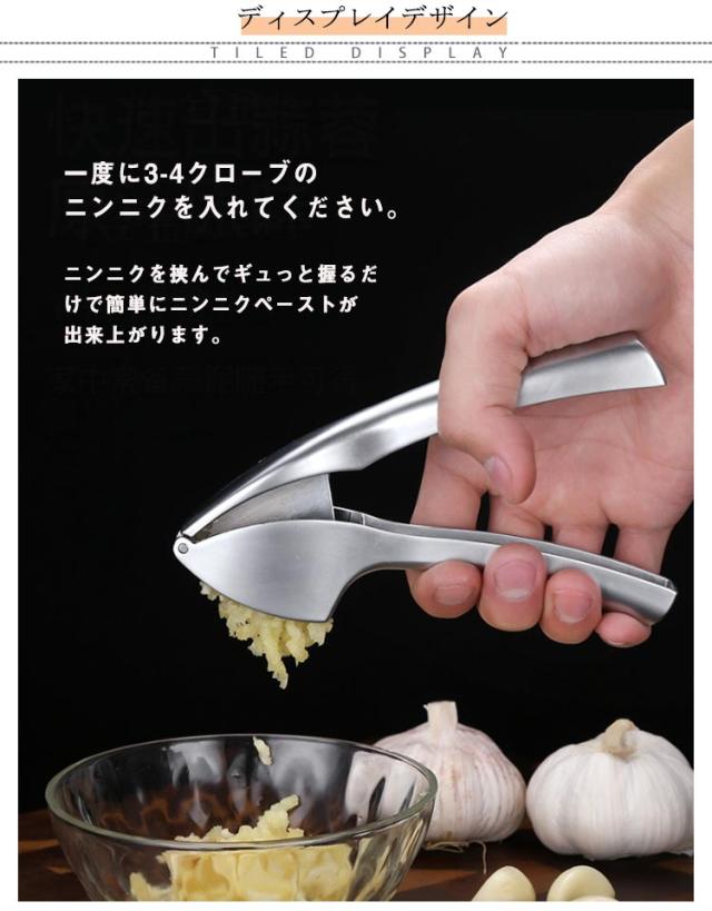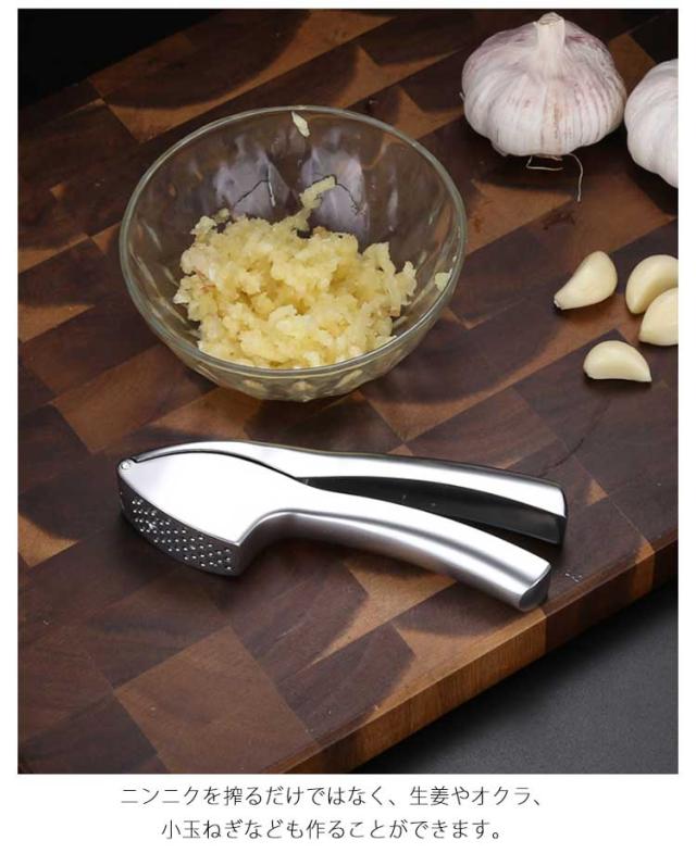 | 手を汚さず楽に潰せるのでとても便利なガーリックプレスです。 一度に3-4クローブのニンニクを入れてください。 ニンニクを挟んでギュっと握るだけで簡単にニンニクペーストが出来上がります。 アルミニウム製なので、さびにくくて耐久性に優れています。 人間工学に基づいた作られるハンドルだから、優れたグリップを提供します。 使用後は水で洗うだけ!手間をかけずに、きれいに洗えるのでお手入れもラクラク! ニンニクを搾るだけではなく、生姜やオクラ、小玉ねぎなども作ることができます。 | |