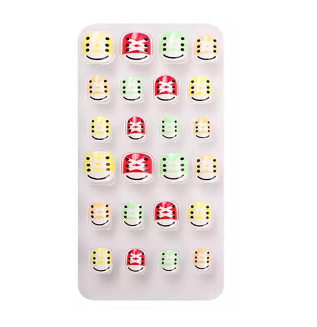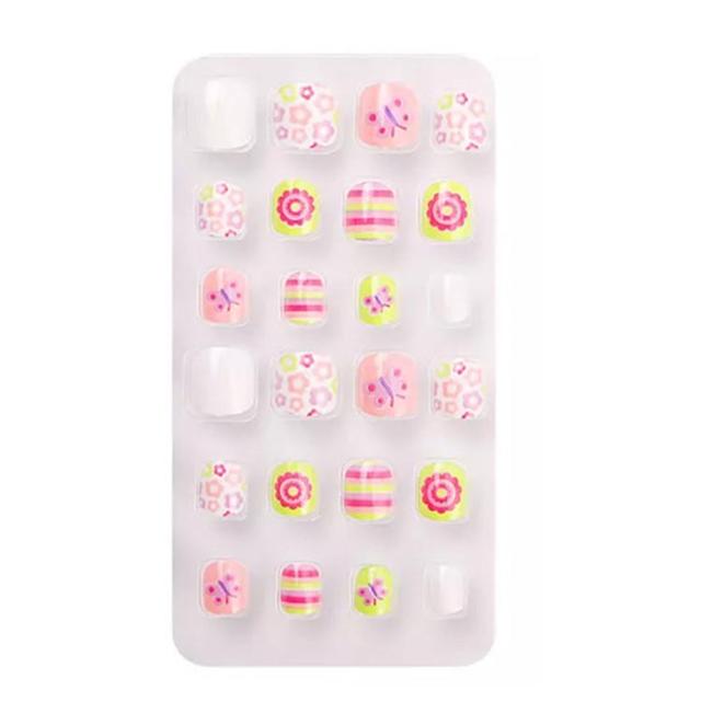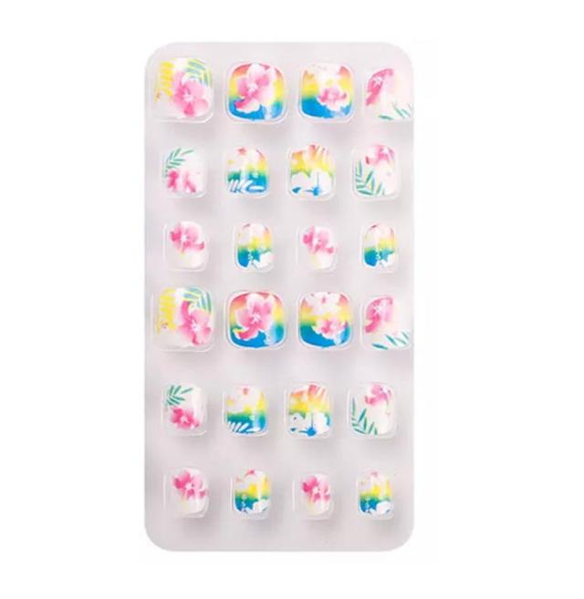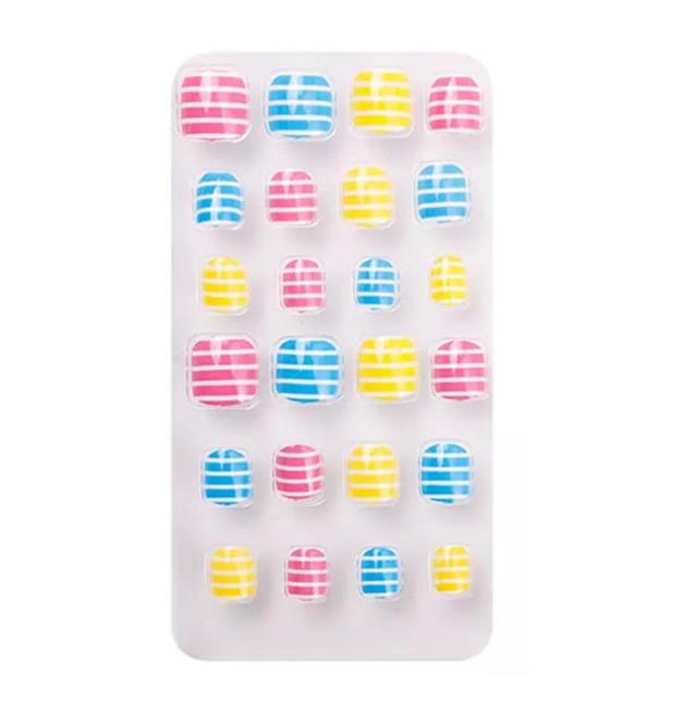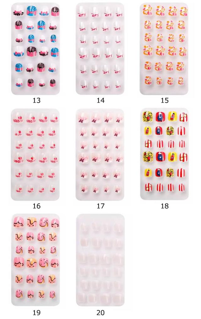 | サイズについての説明 | 【商品名】子供用ネイルチップ 【セット内容】24枚入り(粘着テープ付き) 【素材】プラスチック 【特徴】子供と一緒に楽しいネイル遊びをしてください。 特別な日のネイルに最適のネイルチップ。自爪につけるだけで指先のオシャレが簡単に! 付け爪用粘着テープ付きで簡単装着可能! 子供の爪のサイズを研究して作られたチップが24枚入り。 |