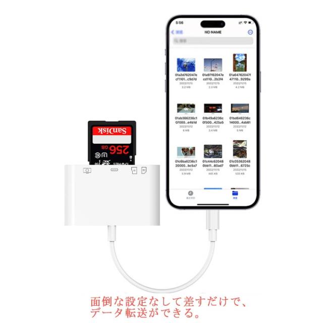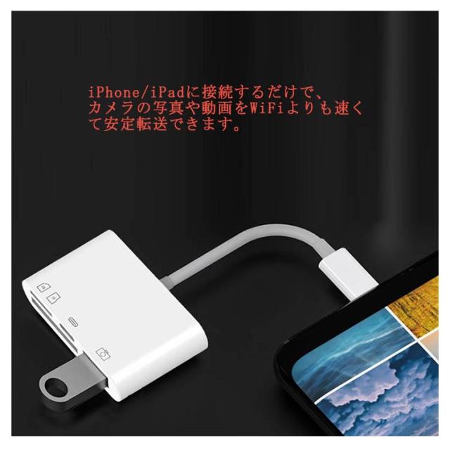 | 4in1 Lightning USB変換アダプタ SDカード/TFカードiPhone/iPad専用 充電しながら、双方向データ転送も楽にできます。 面倒な設定なして差すだけで、データ転送ができる。 iPhone/iPadに接続するだけで、 カメラの写真や動画をWiFiよりも速くて安定転送できます。 | |