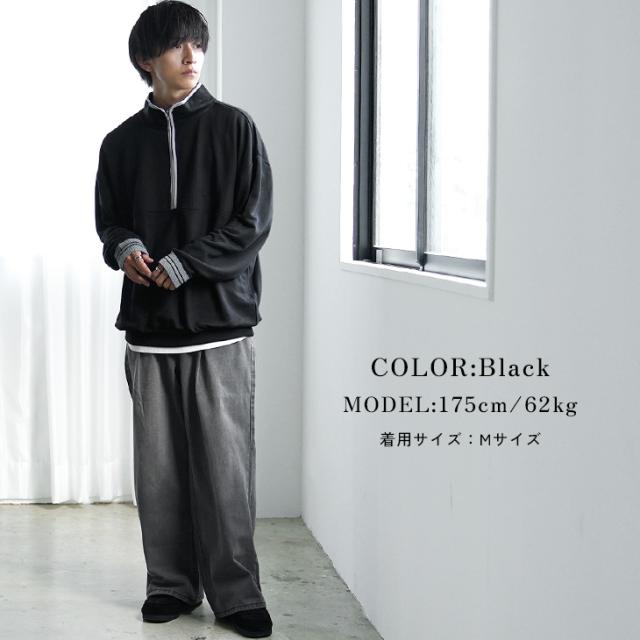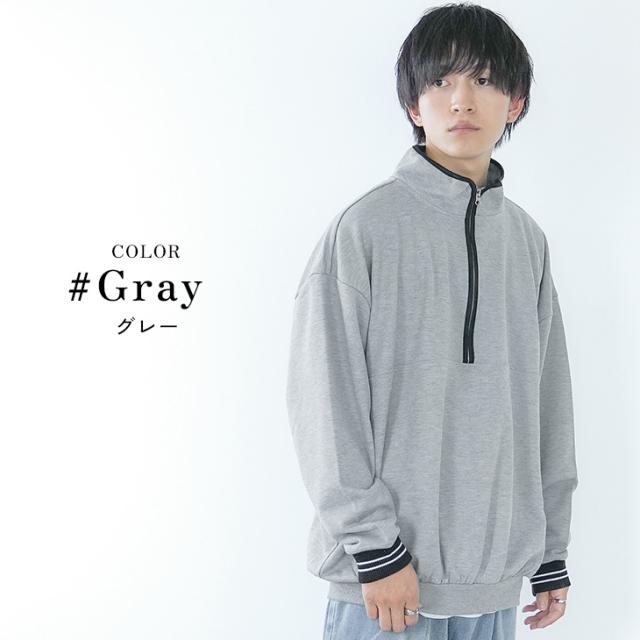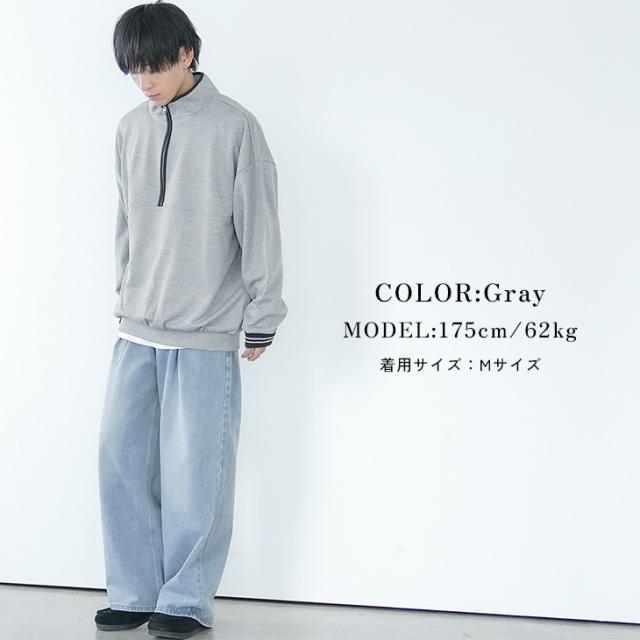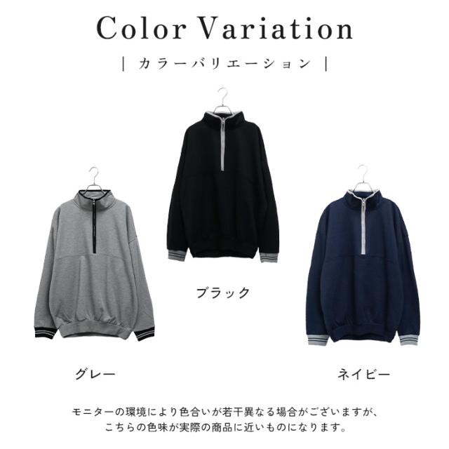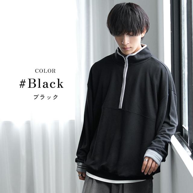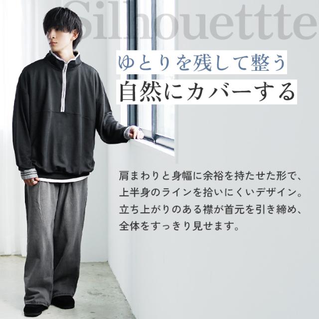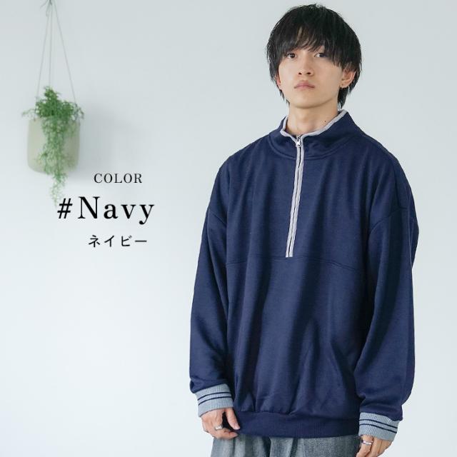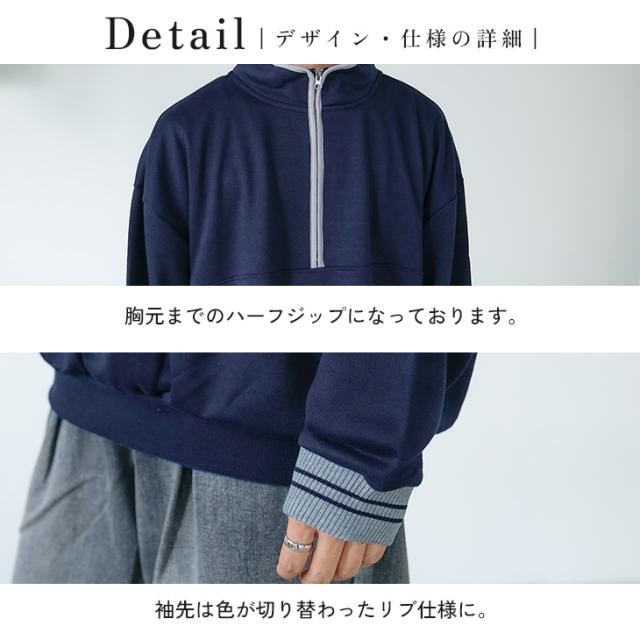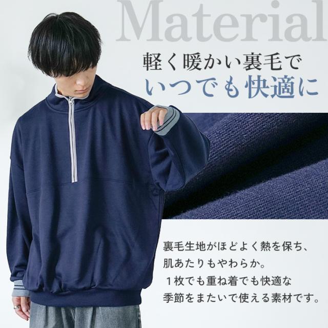 首元や手首のリブ部分に配色デザインを施したシンプルなハーフジップ。スウェットのようなカジュアルな着心地でゆったりとした着心地を実現します。また肩回りなどに余裕を持たせており、体のラインを拾わないのも嬉しいポイント。