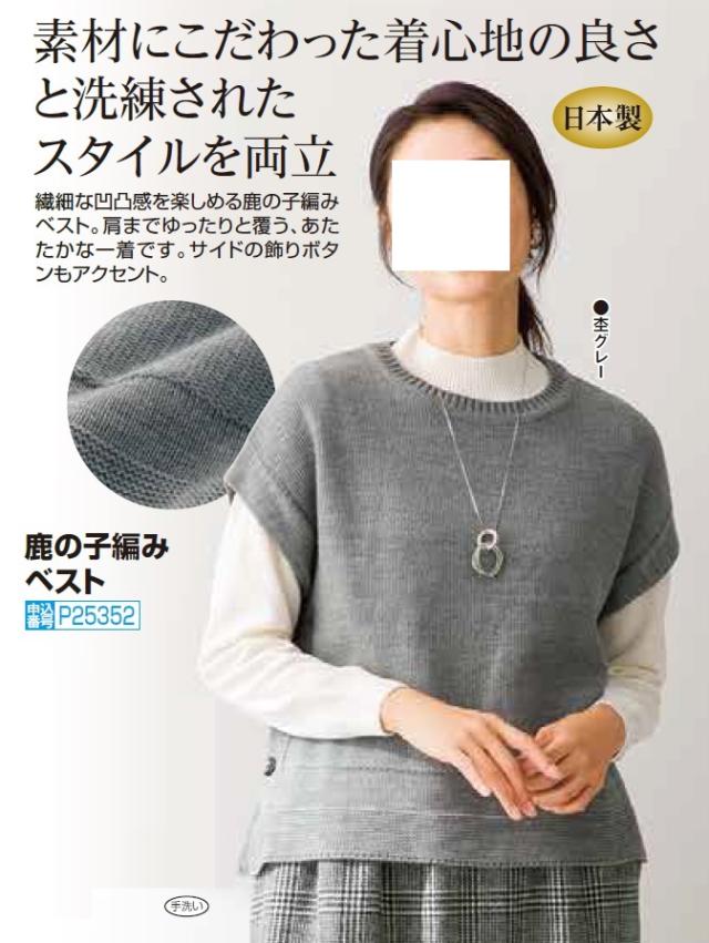 ベスト 半袖 プルオーバー ニット レディース 日本製 鹿の子編みベスト 杢調グレー 婦人服 ミセス シニア 女性 クルーネック 丸首 無地 シンプル 上品 アクリル ウール シニアファッション 40代 50代 60代 70代 80代 母の日 お母さん 秋物 冬物 秋冬 fuji p25352