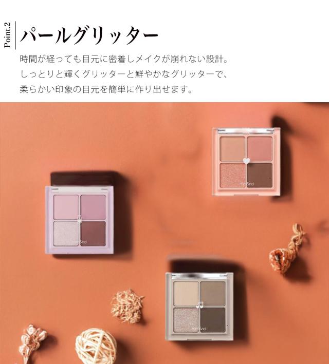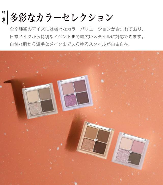 肌に馴染みやすく使いやすい配色で、滑らかで使い心地のいいアイシャドウ。マットカラーとグリッターで上品にもクールにも。