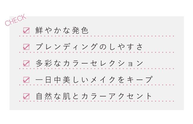5段階で体系化された明度で色の混じり気なく、より深みがあ出る陰影レイヤリング ・同じように見えて全て異なる明度 ・マットカラーとグリッターカラーの組み合わせ ・超微粒子のマットカラーが粉飛びなく密着 ・体温で溶け、パサパサ感のないしっとりとしたグリッターカラー |