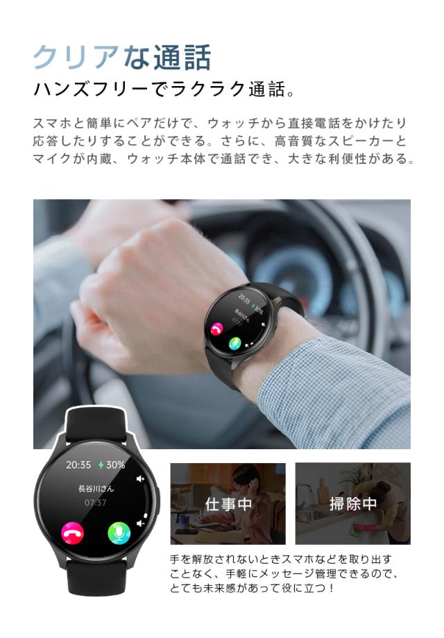 スピーカーとマイクが搭載、スマホと接続すれば、スマホを取り出さず、スマートウォッチで電話を発信したり、直接通話したりすることができます。