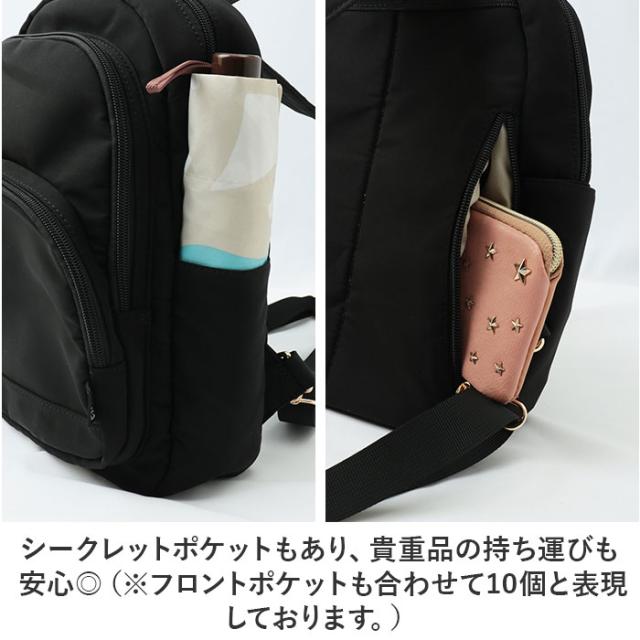 | 商品説明 | ・シーンや用途に合わせて使い分け♪毎日大活躍の「ナイロンボディリュック」が新登場。 【持ち方を選べる2WAYタイプ】 ・ショルダー部分のファスナーを閉めるとボディバッグに、ファスナーを開けるとリュックに変身☆ベルトは左右どちらにも付け替えでき、簡単&自由にスタイルチェンジ! 【使い心地軽やか】 ・体に負担がかかりにくい軽量設計。両手が空いて動きやすく、長時間の移動もストレスフリー。 【コンパクトなサイズ感】 ・お出かけのマストアイテムがすっきりまとまるミニリュック。満員電車などの人混みでも、邪魔になりにくい! 【仕分けしやすい3層式】 ・メインルーム&フロント2つのポケットの3層デザイン。小物の整理整頓がラクラク。全てラウンド型に大きくオープン! 【A5サイズ対応のメインルーム】 ・ダブルファスナー式のメインルーム内側は、A5サイズのノートや500mlペットボトルが縦向きにすっぽり。長財布やミニポーチなども収納可能。 【充実の10ポケット仕様】 ・内側・外側合わせて10個のポケットを装備!細々した物が迷子になりにくくサッと出し入れOK。シークレットポケットもあり、貴重品の持ち運びも安心◎(※フロントポケットも合わせて10個と表現しております。) 【ちょっとの雨なら大丈夫】 ・表面に汚れや水をはじく撥水加工済み。お手入れも拭き取るだけ。(※完全防水ではありません。濡れた場合はすぐに拭き取ってください。) 【シンプルなデザイン】 ・落ち着きのあるカラーを使い、年代問わず使いやすい仕上がり。お気に入りのカラーをチョイスして♪ 【ポケット仕様】 ・内側:オープンポケット×1 ・前面:ファスナーポケット×1(内側にオープンポケット×1) ・最前面:ファスナーポケット×1(内側にオープンポケット×2、ファスナー式メッシュポケット×1) ・サイド:オープンポケット×2 ・背面:シークレットポケット×1 |