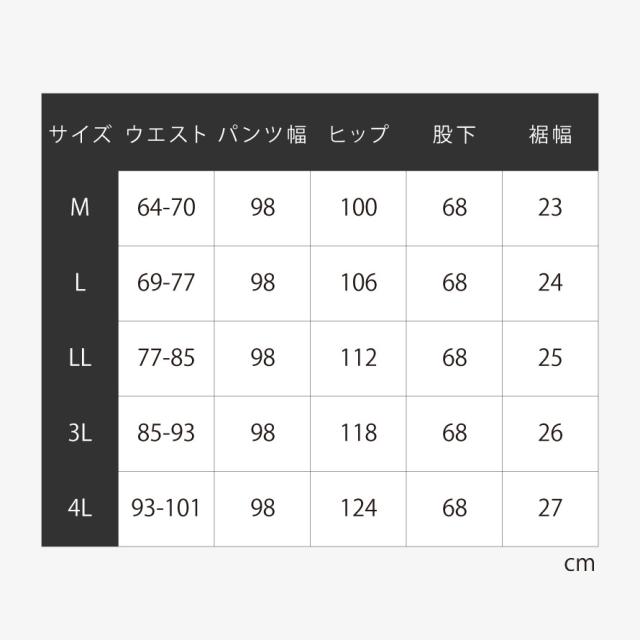 ■サイズ:M/ウエスト64-70、パンツ幅98、ヒップ100、股下68、裾幅23、L/ウエスト69-77、パンツ幅98、ヒップ106、股下68、裾幅24、LL/ウエスト77-85、パンツ幅98、ヒップ112、股下68、裾幅25、3L/ウエスト85-93、パンツ幅98、ヒップ118、股下68、裾幅26、4L/ウエスト93-101、パンツ幅98、ヒップ124、股下68、裾幅27cm