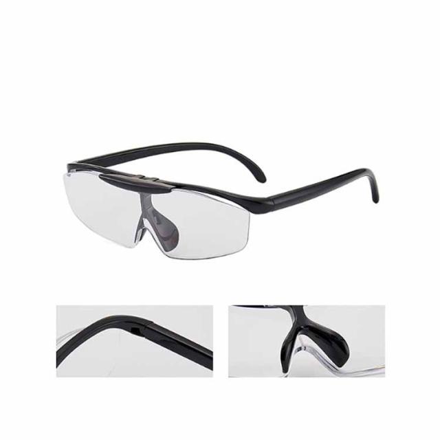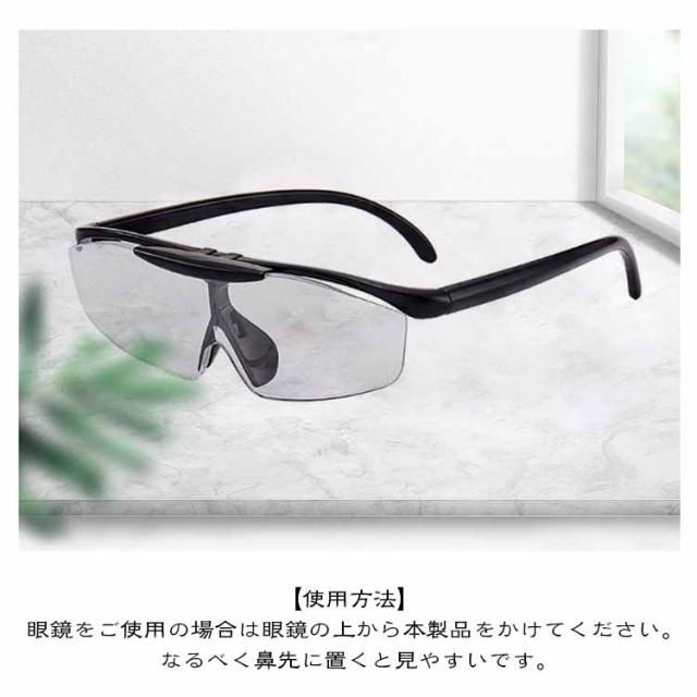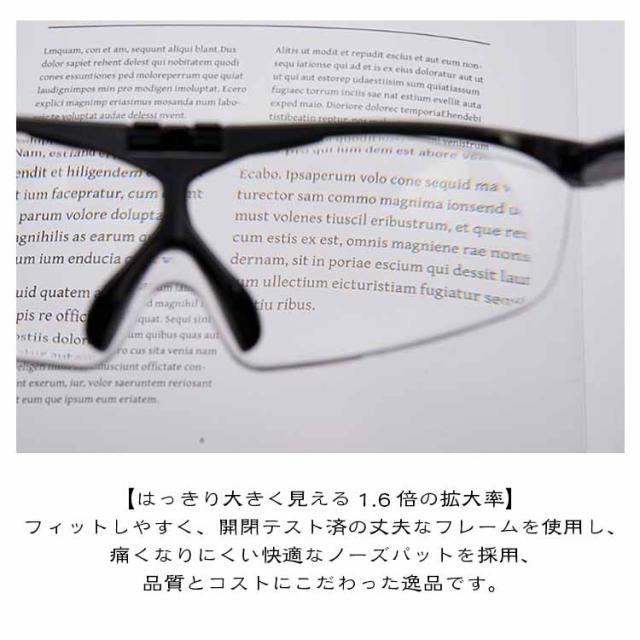 | 眼鏡の上からそのままかけられる軽くクリアな視界で快適の眼鏡ルーペ。 クリアな視界で小さな文字もはっきり見える眼鏡型ルーペ。無理の無い体勢で文字を読め、メガネの上から使える便利なメガネ型ルーペ(拡大鏡)です。 【ワンタッチ跳ね上げ式で便利な拡大鏡ルーペ 】遠くを見たい時に不便だったメガネ型ルーペのデメリットを解消したレンズ跳ね上げ型。見る方向によってルーペを外したりかけたりする必要がございません。 【はっきり大きく見える1.6倍の拡大率】フィットしやすく、開閉テスト済の丈夫なフレームを使用し、痛くなりにくい快適なノーズパットを採用、品質とコストにこだわった逸品です。 【こんなシーンにおすすめ】新聞等の細かい文字、精密作業、手芸、プラモデル作成等、幅広くどんなシーンでもお使いいただけます。男女兼用でお使いいただけます。 【使用方法】眼鏡をご使用の場合は眼鏡の上から本製品をかけてください。 なるべく鼻先に置くと見やすいです。 対象物から20〜40cmの距離で見やすい位置を探します。拡大する必要がないところを見る場合は、レンズを上に跳ね上げておくことができます。 | |