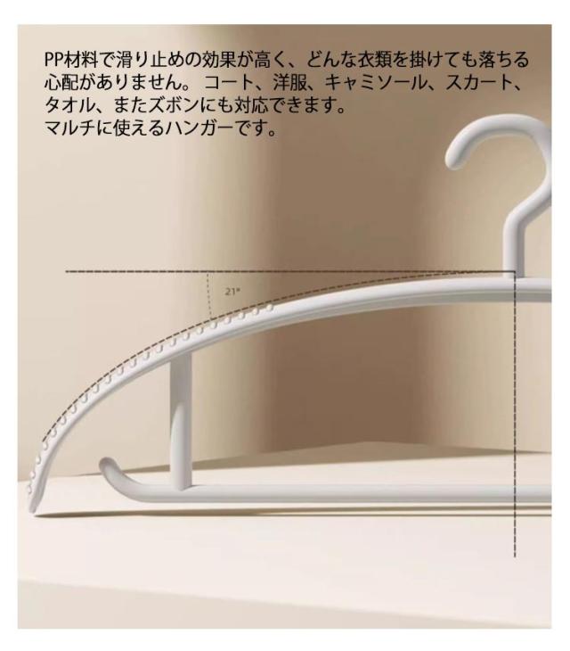 | 【ハンガーを太くしたデザイン】衣服の肩構造にフィットし、変形やダブつきがありません。 【肩の跡がつきにくい】大切な洋服をいつもきれいなスタイルをキープしてくれます。 【すべらない】PP材料で滑り止めの効果が高く、どんな衣類を掛けても落ちる心配がありません。 コート、洋服、キャミソール、スカート、タオル、またズボンにも対応できます。マルチに使えるハンガーです。 【高品質材料】耐久性が高く丈夫なPP素材、変形しにくく、臭いもありません。防錆効果もあり、頑丈なので長期にわたってご愛用いただけます。 【考え抜かれたフックデザイン】フックのデザインにより、ストラップ付きの衣類を掛けやすく、風による衣類の吹き飛ばしを防ぎます。 | |