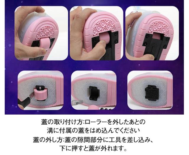 | 18.5-26cm! おしゃれなシューズが一瞬でローラースケートに! ★ローラーの出し入れが可能な2WAYシューズ ローラースケートほど大掛かりでなく、気楽に履けるのでスーっと滑る感覚でスリルを味わえます! ★初心者でも乗りやすい 前輪が補助輪となる2輪式ので、初心者の方でもすぐに楽しく滑れるようになります。 ★ローラーをしまえばおしゃれなシューズに早変わり! かかと部分のボタンをたったひと押しするだけで、ローラーの出し入れができるので操作が簡単! ★足元が輝き、いつものお出掛けがもっと楽しくなりそう! ★履きやすい設計で、通学はもちろんのこと、おでかけ用としても活躍してくれます。 ローラーの取り外し方:靴をしっかりと押さえて側面を両親指で押しながら持ち上げながら車軸を外してください。 ローラーの付け方:ローラーの車軸をかかとの溝に合わせて、カチッと音が鳴るまで押し入れてください。 蓋の取り付け方:ローラーを外したあとの溝に付属の蓋をはめ込んでください 蓋の外し方:蓋の隙間部分に工具を差し込み、下に押すと蓋が外れます。 | |