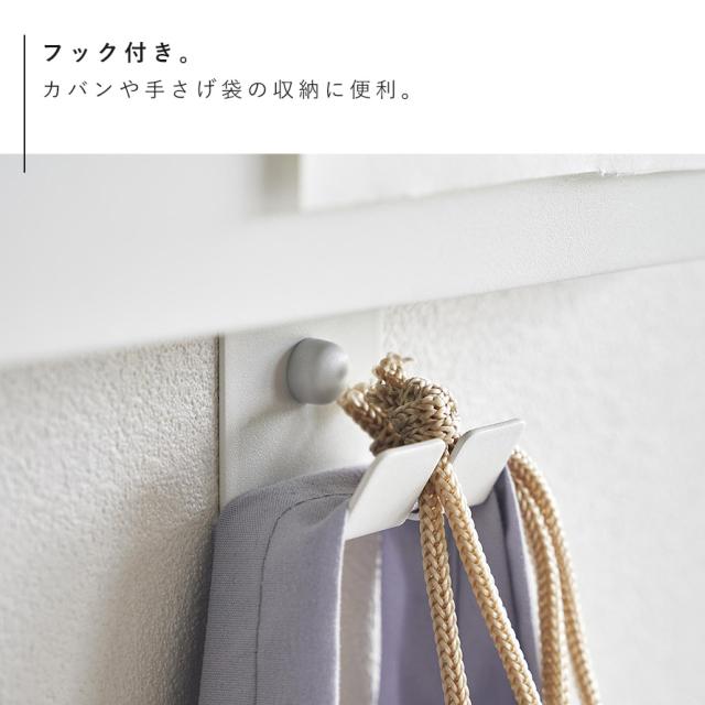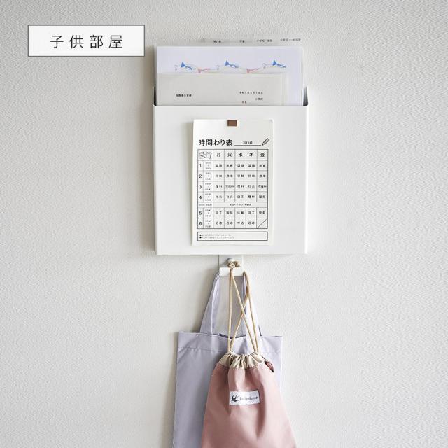 石こうボードピンで壁に取り付け可能な収納ホルダー。プリント類や手さげ袋などを壁に浮かせて一括収納。
