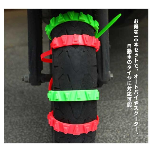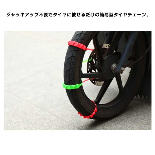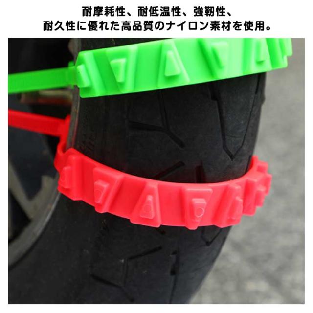 | オートバイクやスクーター用簡易型タイヤチェーン。 30本セット ジャッキアップ不要でタイヤに被せるだけの簡易型タイヤチェーン。 お得な10本セットで、オートバイやスクーター、自動車のタイヤに対応可能。 凸凹設計で、雪の泥や砂に優れたグリップを提供し、雪道など悪路も安全に走行可能。 非金属性な柔らかい素材、ホイールや路面に損傷を与えません。 耐摩耗性、耐低温性、強靭性、耐久性に優れた高品質のナイロン素材を使用。 季節を問わず、冬、雪のときだけではなく、スキー、クロスカントリー、野外冒険、山岳運転にも。 | |