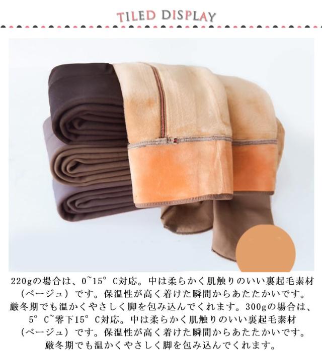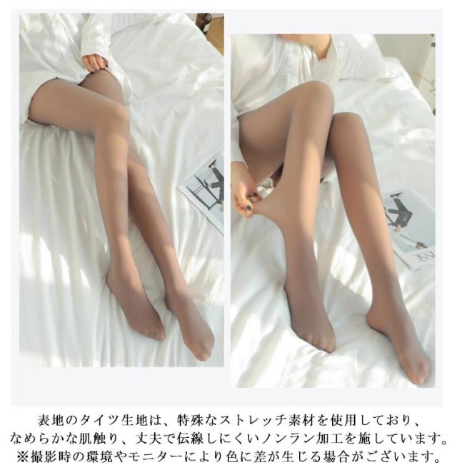 | 【素肌感タイツ】うっすら肌が透けて見えるストッキングのような見た目なのに、 裏起毛でしっかり暖かいタイツです。裏起毛がベージュなのでぱっと見はまるでストッキングのような透け感があり自然な履き心地♪ 【裏起毛】220gの場合は、0~15°C対応。中は柔らかく肌触りのいい裏起毛素材(ベージュ)です。保温性が高く着けた瞬間からあたたかいです。厳冬期でも温かくやさしく脚を包み込んでくれます。300gの場合は、5°C~零下15°C対応。中は柔らかく肌触りのいい裏起毛素材(ベージュ)です。保温性が高く着けた瞬間からあたたかいです。厳冬期でも温かくやさしく脚を包み込んでくれます。 【履きやすい】ウェスト部の幅を広く設計すろことで、しっかりとしたフィット感と動きやすさを実現。深めの股上でお腹周りもしっかりサポートします。レッグ部に特殊な設計を施した、伸縮性が良くて、履やすいタイツです。 【耐久性】表地のタイツ生地は、特殊なストレッチ素材を使用しており、なめらかな肌触り、丈夫で伝線しにくいノンラン加工を施しています。※撮影時の環境やモニターにより色に差が生じる場合がございます。 【美脚タイツ】しっかり脚からお尻にフィットするので、細身で繊細なスタイルを引き出してくれて、美脚を徹底的に実現します。寒い日(5°C~零下15°C)の通勤、通学、旅行、凍えるような夜のデートやお出かけなどに最適です。 | |