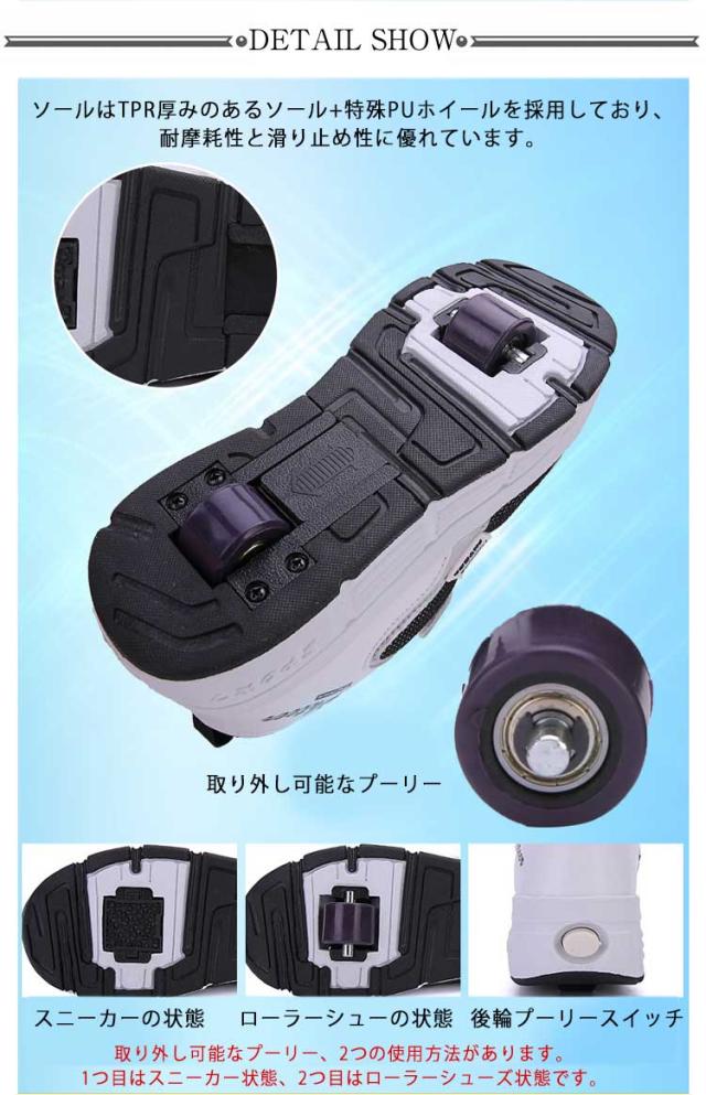 | 大人用と子供用のサイズのローラーシューズ ソールはTPR厚みのあるソール+特殊PUホイールを採用しており、耐摩耗性と滑り止め性に優れています。 取り外し可能なプーリー、2つの使用方法があります。1つ目はスニーカー状態、2つ目はローラーシューズ状態です。 便利で実用的なので、家族でまとめ買いするのもおすすめです。 | |