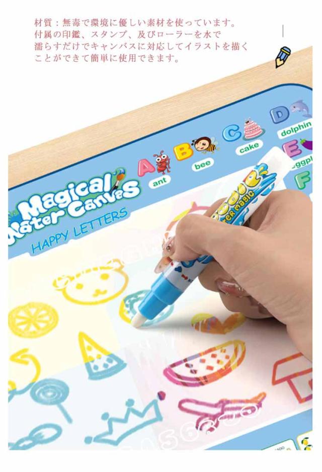 | 水をペンに入れるだけでおえかきできるお絵描きシートです インクなどは要らず、水だけで描けるお絵描きシートですので、床、壁、洋服を汚しません。 100cm×80cmの大きいサイズですので、子供が自由にのびのびと楽しくおえかきができます。 お子さんへの誕生日・入園・入学・クリスマスプレゼントとしても最適です。 材質:無毒で環境に優しい素材を使っています。 付属の印鑑、スタンプ、及びローラーを水で濡らすだけでキャンバスに対応してイラストを描くことができて簡単に使用できます。 【水で描いても汚れない】 付属のペンに水を入れたらすぐお絵かきができるので非常に簡単です。約10分後には乾いてすぐ繰り返し使えるので、洋服やお部屋を汚さずにのびのびお絵かきすることができます。シートは折り畳んで収納できるので、お出かけ先にも持ち運びでき便利です。 【知育おもちゃ】 水で描くと発色しカラフル色を楽しむことができます。お絵かきして遊ぶことで、カラーセンスを磨き英語や数字の勉強もできます。子供の右脳開発、認識能力、創造力などを向上させることができます。 | |