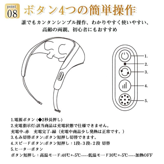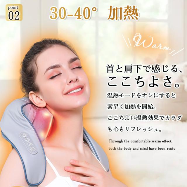 【ヒーター機能搭載】:もみ玉にヒーターが内蔵さており、約30-40℃に加熱し、あたたかなマッサージをを行ってくれます。リラックスと筋肉のコリをほぐすことに役立ちます。